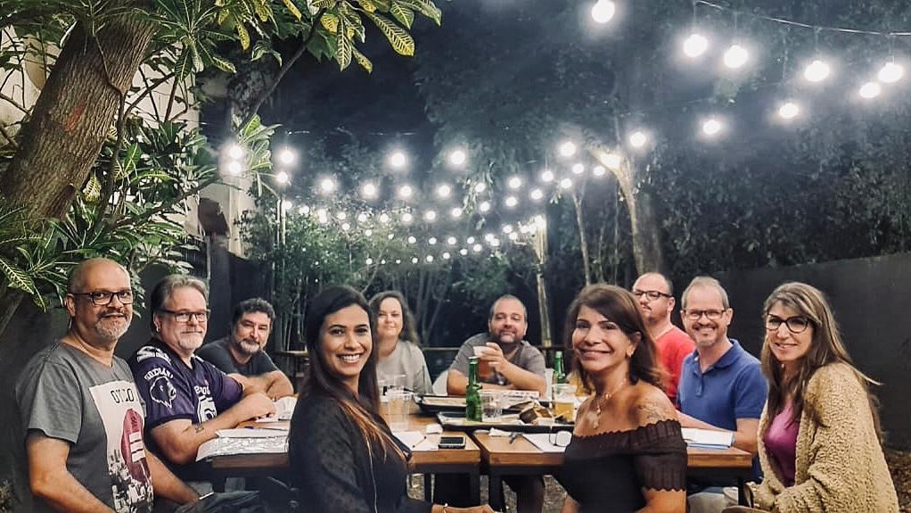 Por exemplo, mesmo com o ano já solto nos módulos online, semana passada recém marcou o retorno da Oficina Santa Sede com os encontros presenciais. Sim, dois anos se foram e eu nem me lembro de ter ficado tanto tempo distante da boemia crônica… Quarta-feira passada, pela manhã, aconteceu com a turma Café lá na Sabor de Luna. À noite, Master Class em homenagem a Moacyr Scliar na Alameda República. As duas mesas ao ar livre, perfeitas para servirem de “descompressão” ao confinamento. Muita alegria nos reencontros.