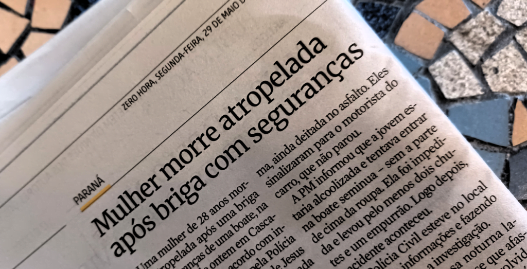 O preâmbulo se faz necessário para que eu comente com conhecimento de causa uma notícia trágica: a morte por atropelamento de uma moça em Cascavel, no Paraná. De acordo com o jornal, ela foi agredida por seguranças de uma casa noturna e deixada no leito da rua desacordada ou sem ação – pois ali permaneceu sem movimento até ser atropelada e arrastada por dezenas de metros. O motorista fugiu deixando de prestar socorro. Tudo teria acontecido porque ela tentava entrar no local embriagada e descomposta. A cena foi testemunhada por diversas pessoas.