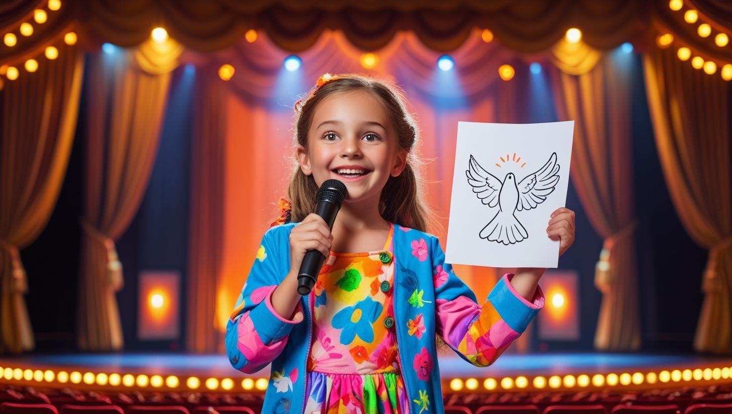 O público chega e cada um recebe a indicação de sua poltrona. Minutos antes da palestra o auditório já está lotado e, estranhamente, as luzes da plateia permanecem apagadas. Ao centro do palco, iluminado pela luz de um único spot, um microfone. Depois dos clássicos três sinais sonoros, uma criança de, sabe-se lá, oito anos de idade, assume o lugar reservado à estrela da noite. Traz consigo  um desenho de pombinha, retira o microfone do pedestal, dá boa noite e pede: