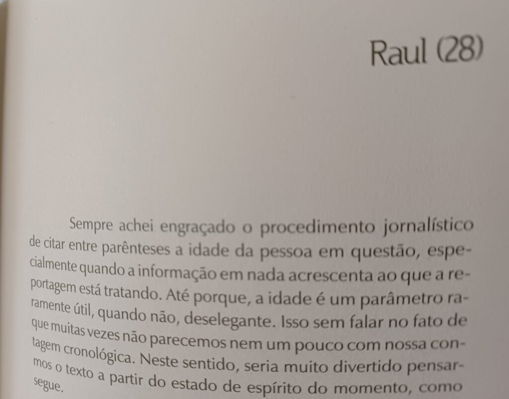 Sempre achei engraçado o procedimento jornalístico de citar entre parênteses a idade da pessoa em questão, especialmente quando a informação em nada acrescenta ao que a reportagem está tratando. Até porque, a idade é um parâmetro raramente útil, quando não, deselegante. Isso sem falar no fato de que muitas vezes não parecemos nem um pouco